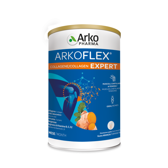 ARKOFLEX® COLLAGENE EXPERT è un'associazione di Collagene idrolizzato e di tipo II nativo, Acido ialuronico, Magnesio, Manganese, Curcuma e Vitamine C, B1, B2, B6, B12 e D. Con edulcoranti.