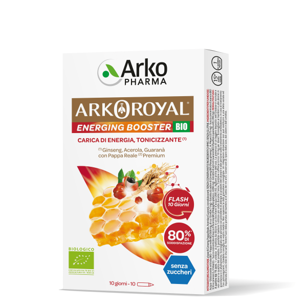 ARKOROYAL® PAPPA REALE PREMIUM ENERGING BOOSTER BIO SENZA ZUCCHERI è un integratore alimentare a base di Ginseng, Pappa Reale, Acerola e Guaranà, con edulcoranti.