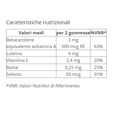 Per 2 gommose% VNR*Betacarotene3,0 mg Equivalente a Vitamina A500 μg RE63%Luteina4,0 mg Vitamina E2,4 mg20%Rame0,25 mg25%Selenio50 μg91%* VNR : Valori Nutrizionali di Riferimento
