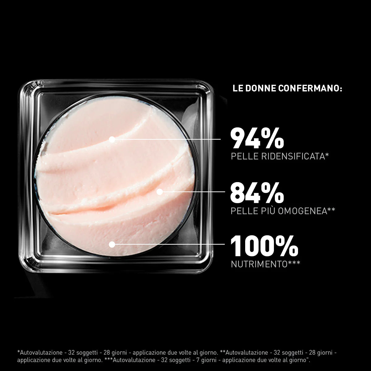 NUTRIMENTO INTENSIVO: Complesso vegetale nutriente (Olio di Enotera, Borragine, Camelia, Jojoba, Canola, Squalano) + ceramidi, omega, vitamine