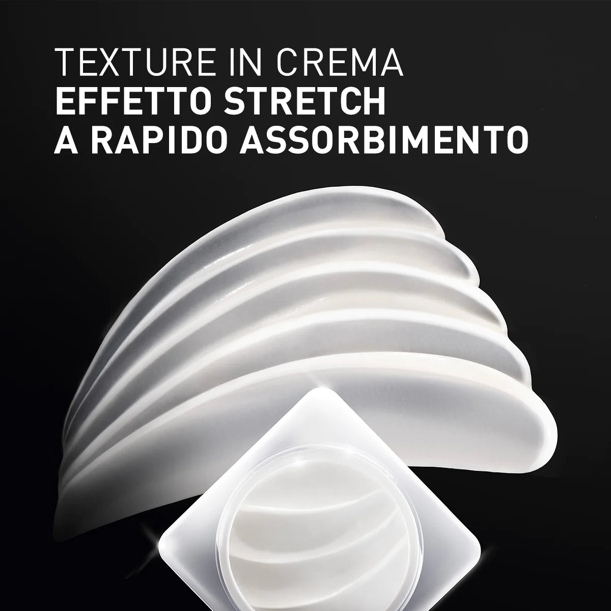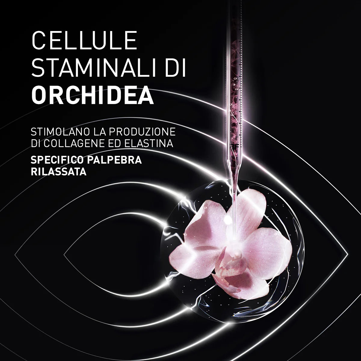 Corregge tutti i tipi di rughe del contorno occhi e le occhiaie: grazie ad un complesso di principi attivi ad alta precisione [peptidi rilassanti + cellule staminali vegetali + NCEF], agisce rilassando i tratti per ridurre le rughe di espressione, esercitando un'azione levigante sulle rughe a zampa di gallina con un effetto idratante e rimpolpante.