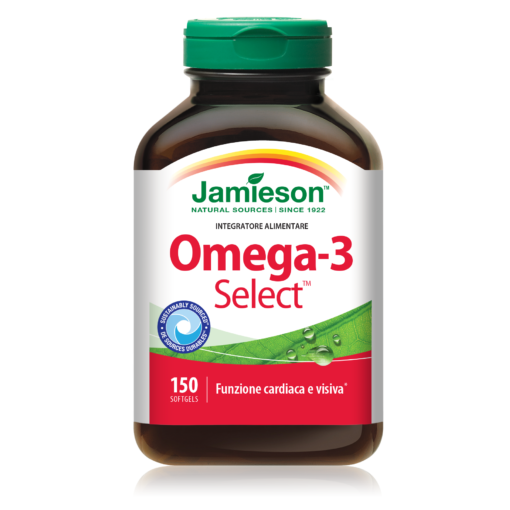 Omega-3 Select di Jamieson contiene olio di pesce, fonte naturale di acidi grassi polinsaturi della serie Omega-3 (acido eicosopentanoico o EPA e acido docosoesanoico o DHA). Questi acidi grassi contribuiscono al benessere cardiovascolare, alla normale funzione cerebrale e al benessere della vista. Ogni softgel di Omega-3 Select apporta 300 mg di EPA e 200 mg di DHA. L’olio viene estratto da pesci di piccola taglia, come acciughe, sardine e sgombri, contenenti una quantità più ridotta di contaminanti rispetto ai pesci di stazza grande. L’olio di pesce viene purificato attraverso un processo di distillazione molecolare così da rimuovere eventuali tracce di mercurio ed altri microcontaminanti.